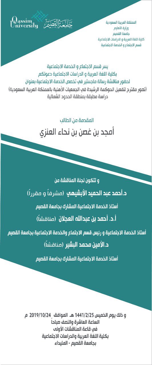 قسم الاجتماع والخدمة الاجتماعية جامعة القصيم On Twitter يسر قسم الاجتماع والخدمة الاجتماعية بكلية اللغة العربية والدراسات الاجتماعية دعوتكم لحضور مناقشة رسالة ماجستير في الخدمة الاجتماعية بعنوان تصور مقترح لتفعيل الحوكمة